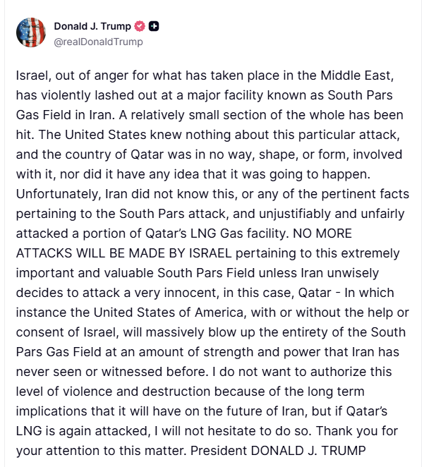 Trump is trying hard top draw a red line with this one. Again, defending U.S. ally Qatar with, “If Qatar’s LNG gets hit again, we level South Pars”. That is not vague diplomacy, that is a direct and conditional threat.